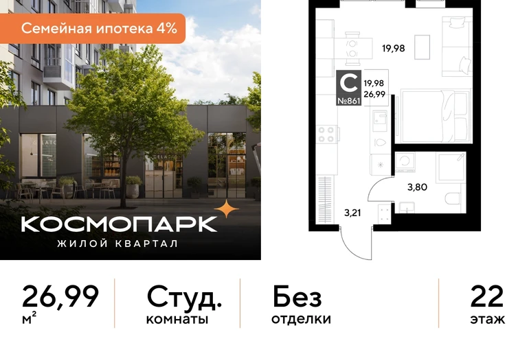 Продается студия № 861 по адресу: Калужская область, Калуга. Общая площадь квартиры - 26.99 кв. м., этаж 22 из 25, секция 4. Тип проекта, по которому построен дом - монолит, компания-застройщик - DOGMA, ООО СЗ Д-Финанс. Стоимость квартиры - 5082217 Р. Срок сдачи - 1 квартал 2027. Более подробная информация по телефону. <br><br> <br><br> ВЫГОДНЫЕ УСЛОВИЯ: <br><br> При покупке квартиры в ипотеку мы поможем правильно оформить заявку и подберем самые выгодные условия по ставке и первоначальному взносу. <br><br> • Выгодные ипотечные ставки - семейная ипотека 4%.* <br><br> • Рассрочка без первоначального взноса! Оформление на 1 год. <br><br> <br><br> Космопарк - уютный квартал комфорт-класса на левом берегу Оки. Расположен в развитом Ленинском районе Калуги, недалеко от центра города. Вокруг - живописные парки, музеи и чистые пляжи. <br><br> <br><br> ПРЕИМУЩЕСТВА: <br><br> • Квартиры с видом на реку Оку <br><br> • Разнообразные функциональные планировки <br><br> • Потолки от 2,65 м <br><br> • Умный дом с IP-домофонией <br><br> • Закрытые дворы с всесезонным озеленением <br><br> • Безопасная и безбарьерная среда <br><br> • Кладовые с прямым доступом на лифте <br><br> • Наземный паркинг на 1500 машино-мест <br><br> • Собственный комьюнити-центр <br><br> • Коммерческие помещения на первых этажах <br><br> • 4 минуты до ТЦ "Салтыковский" <br><br> • Рядом школа и детский сад <br><br> <br><br> Сочетание городского комфорта с природным окружением. Выгодное расположение, развитая социальная инфраструктура и отличная транспортная доступность. Квартира от застройщика. <br><br> <br><br> *СЕМЕЙНАЯ ИПОТЕКА: <br><br> - Ставка 4% на весь срок кредита <br><br> - ПСК (полная стоимость кредита) от 6,302% до 24,633% годовых. <br><br> - Срок кредита — от 5 до 30 лет. <br><br> - Минимальный первоначальный взнос — от 20,01%. <br><br> - Досрочное погашение кредита возможно в любой момент без штрафов. <br><br> - Стоимость квартиры фиксируется на весь срок кредитования. <br><br>О застройщике