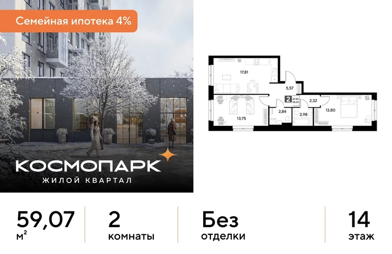 Продается 2-комнатная квартира № 99 по адресу: Калужская область, Калуга. Общая площадь квартиры - 59.07 кв. м., этаж 14 из 25, секция 1. Тип проекта, по которому построен дом - монолит, компания-застройщик - DOGMA, ООО СЗ Д-Финанс. Стоимость квартиры - 10171854 Р. Срок сдачи - 1 квартал 2027. Более подробная информация по телефону. <br><br> <br><br> ВЫГОДНЫЕ УСЛОВИЯ: <br><br> При покупке квартиры в ипотеку мы поможем правильно оформить заявку и подберем самые выгодные условия по ставке и первоначальному взносу. <br><br> • Выгодные ипотечные ставки - семейная ипотека 4%.* <br><br> • Рассрочка без первоначального взноса! Оформление на 1 год. <br><br> <br><br> Космопарк - уютный квартал комфорт-класса на левом берегу Оки. Расположен в развитом Ленинском районе Калуги, недалеко от центра города. Вокруг - живописные парки, музеи и чистые пляжи. <br><br> <br><br> ПРЕИМУЩЕСТВА: <br><br> • Квартиры с видом на реку Оку <br><br> • Разнообразные функциональные планировки <br><br> • Потолки от 2,65 м <br><br> • Умный дом с IP-домофонией <br><br> • Закрытые дворы с всесезонным озеленением <br><br> • Безопасная и безбарьерная среда <br><br> • Кладовые с прямым доступом на лифте <br><br> • Наземный паркинг на 1500 машино-мест <br><br> • Собственный комьюнити-центр <br><br> • Коммерческие помещения на первых этажах <br><br> • 4 минуты до ТЦ "Салтыковский" <br><br> • Рядом школа и детский сад <br><br> <br><br> Сочетание городского комфорта с природным окружением. Выгодное расположение, развитая социальная инфраструктура и отличная транспортная доступность. Квартира от застройщика. <br><br> <br><br> *СЕМЕЙНАЯ ИПОТЕКА: <br><br> - Ставка 4% на весь срок кредита <br><br> - ПСК (полная стоимость кредита) от 6,302% до 24,633% годовых. <br><br> - Срок кредита — от 5 до 30 лет. <br><br> - Минимальный первоначальный взнос — от 20,01%. <br><br> - Досрочное погашение кредита возможно в любой момент без штрафов. <br><br> - Стоимость квартиры фиксируется на весь срок кредитования. <br><br>О застройщике